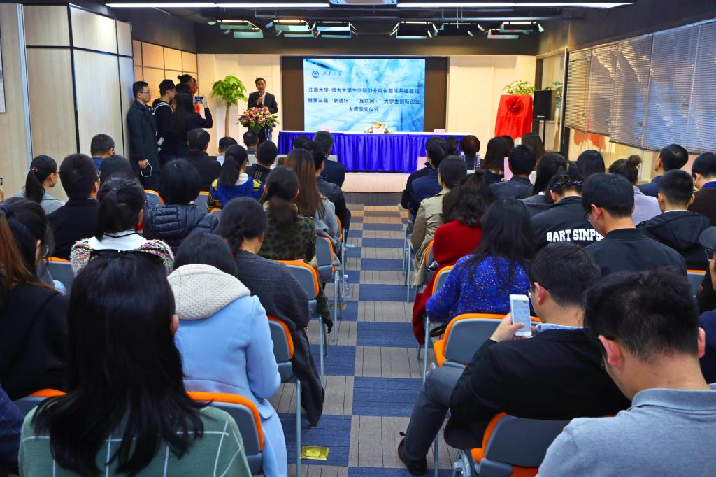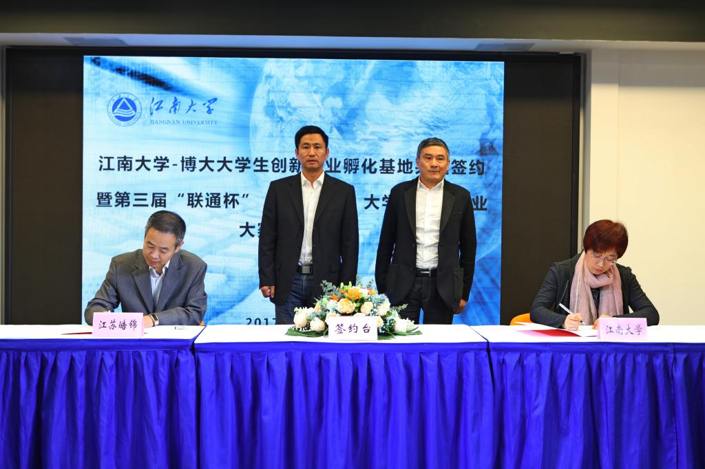 2017年11月14日下午15:30,wwwbet365官方?博大大学生创新创业孵化基地共建签约暨第三届“联通杯”“互联网+”大学生创新创业大赛颁奖仪式在无锡博大众创空间路演大厅隆重举行。我校党委副书记戴月波、江苏皓锦投资管理有限公司董事长吴锦平、联通无锡滨湖分公司总经理王志华、无锡博大置业有限公司总经理岳阳、学生工作处处长张菁燕、无锡博大众创空间有限公司副总经理吴翠、教务处副处长顾志国等领导出席了仪式。我校大学生创新创业优秀指导老师代表,各学院分管学生工作的副书记,获奖项目团队负责人,各学院负责创新创业工作的辅导员以及入住wwwbet365官方博大大学生创新创业孵化基地的项目团队代表参加了活动。签约颁奖仪式由学生工作处副处长陈琳主持。