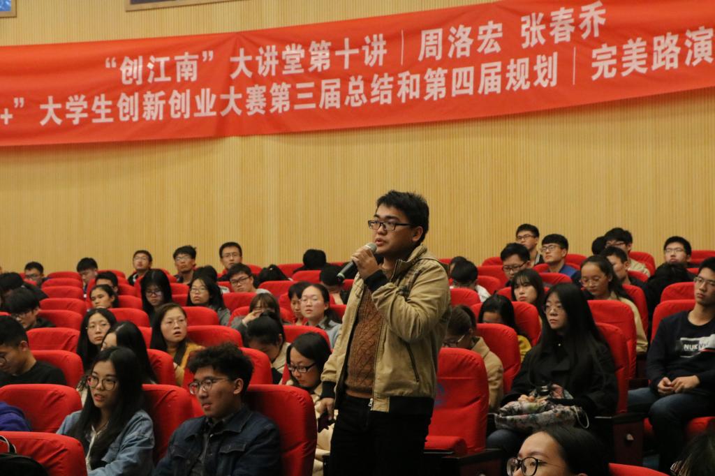 在提问环节,观众踊跃举手,就创业前景、创业定位、比赛技巧、投资人关注的重点等方面发问,周洛宏和张春乔一一作答。指出要跳出比赛谈创业才能正真成为一名创业者,要有严密的逻辑,真实的情感才能成就一份完美路演PPT。